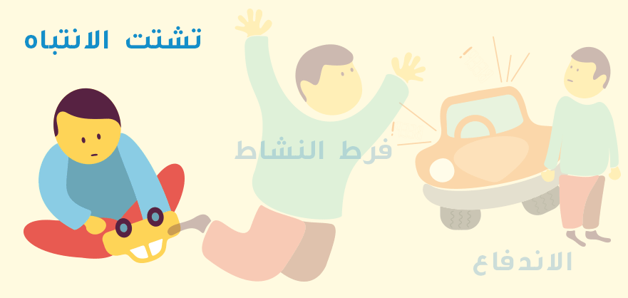 يمكن تقسيم أعراض اضطراب فرط الحركة ونقص الانتباه لدى الأطفال إلى ثلاث فئات؛ تشتت الانتباه، وفرط النشاط والاندفاع.